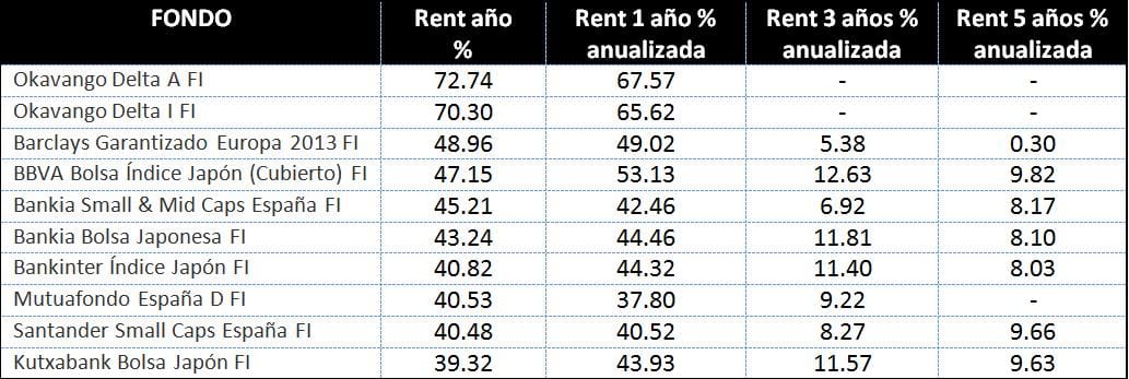 En el caso de los fondos de inversión españoles, y en sintonía con la buena evolución de la renta variable, los resultados de los fondos de inversión nacionales también la de calificarse como de positivos, encontrando tanto la renta variable nacional como en la renta variable internacional muy buenos datos de rentabilidad, con algunos fondos, como es el caso de Okavango Delta A, presentando resultados espectaculares.