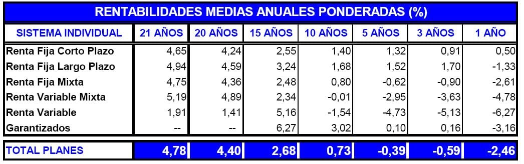 Las rentabilidades medias anuales ponderadas de los Planes de Pensiones del Sistema Individual, en función de la muestra analizada, son las siguientes (haga click en la imagen para verla mejor)